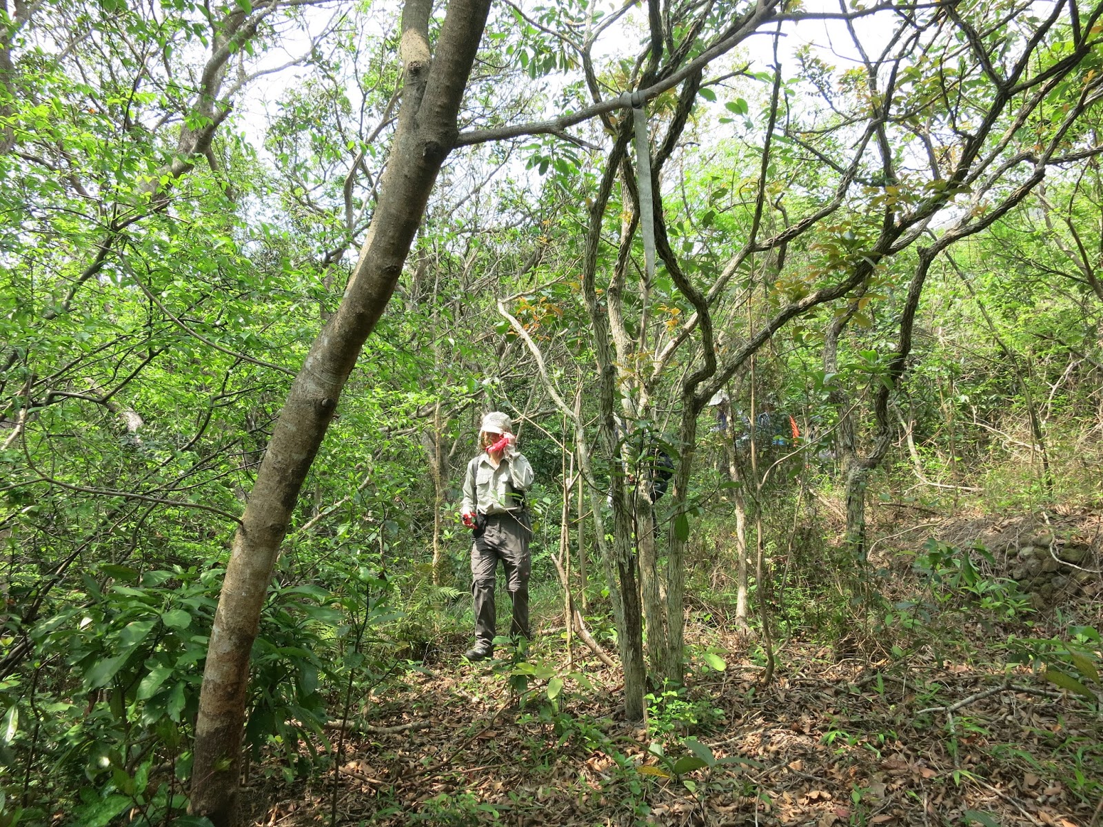 拍照完畢就起步下登一處隱蔽山坡路進入堆填區, 這段路較少人行, 所以野草甚為茂密, 不過就見到有兩株非常燦爛的紅杜鵑花在盛放, 大家在闖過野草叢時仍然可以欣賞杜鵑, 確又是不錯的享受。